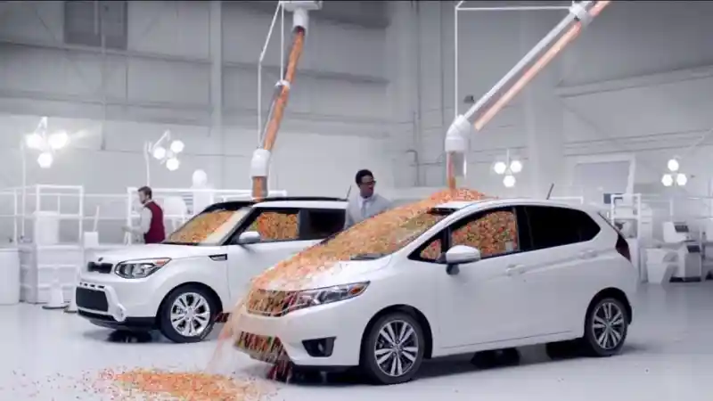 Kabin kedua mobil itupun seketika terisi penuh Jelly Bean. Dan tentu saja Honda Fit yang duluan kepenuhan dan meluap keluar. Video promosi yang dibuat oleh KIA ini pun terasa tak seimbang, karena dua mobil ini tak sejenis.