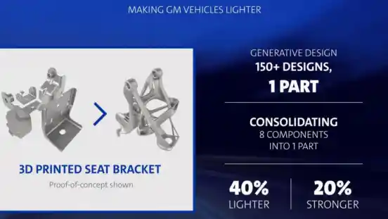 Sebagai bukti konsep, insinyur GM dan Autodesk menciptakan braket kursi menggunakan perangkat lunak. Meskipun ini tidak terdengar terlalu sulit untuk dirancang, perusahaan mencatat braket yang dibuat oleh perangkat lunak itu 40 persen lebih ringan dan 20 persen lebih kuat daripada bagian asli. Ini juga mengkonsolidasikan delapan komponen yang berbeda menjadi bagian cetak 3D.