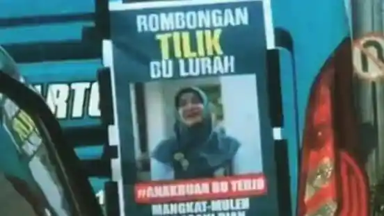 Terlihat foto Bu Tejo dengan tulisan Rombongan Tilik Bu Lurah di bagian atas. Serta hastag #anakbuah Bu Tedjo dan kata-kata, Mangkat-Muleh Ngrasani Dian (Pergi-pulang ngomongin Dian).