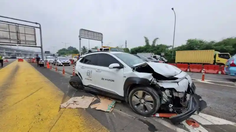 Salah satu kendaraan yang menjadi korban tabrakan beruntun ini adalah Hyundai Kona Electric dengan nomor kendaraan B 1051 SPW. Mobil ini adalah kendaraan Mobile Charger milik PT Hyundai Motors Indonesia (HMID).