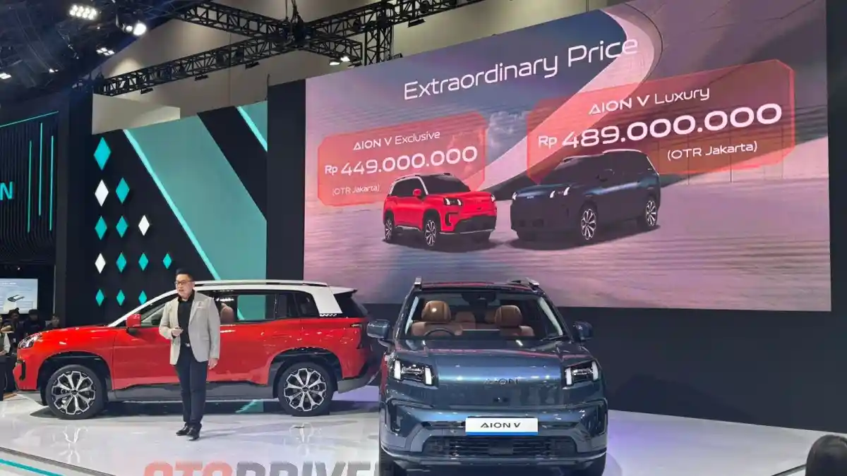 OTODRIVER - AION V resmi dirilis di IIMS 2025 dengan harga mulai Rp 449 juta. Mobil ini juga langsung mencatatkan Surat Pemesanan Kendaraan (SPK) yang fantastis karena sudah mencapai ribuan unit.