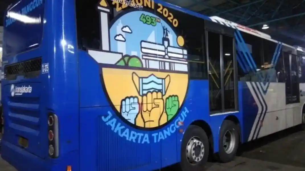 Nuansa new normal yang tengah terjadi saat ini akibat virus corona diwakili dengan grafis bertuliskan Pelopor Protokol Kesehatan Transportasi di sisi kiri buritan bus. Sementara bagian kanannya terdapat logo perayaan ulang tahun ke-493 kota Jakarta. Lengkap dengan jargon Jakarta Tangguh.