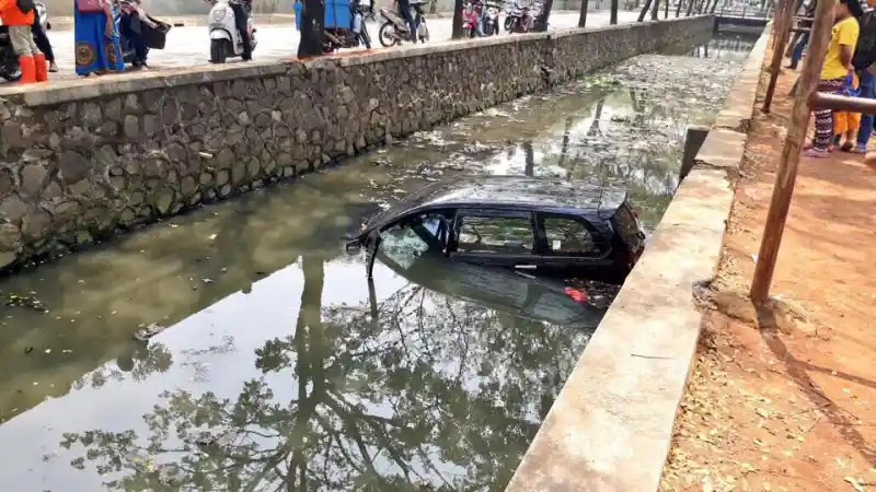 Sebuah Toyota Avanza tercebur ke sebuah saluran air alias kali di daerah Jakarta Barat (8/8). Beberapa fotonya dirilis akun resmi Kepolisian dan menunjukkan Avanza kelir hitam tersebut tampak dalam kondisi yang masih cukup baik secara eksterior.