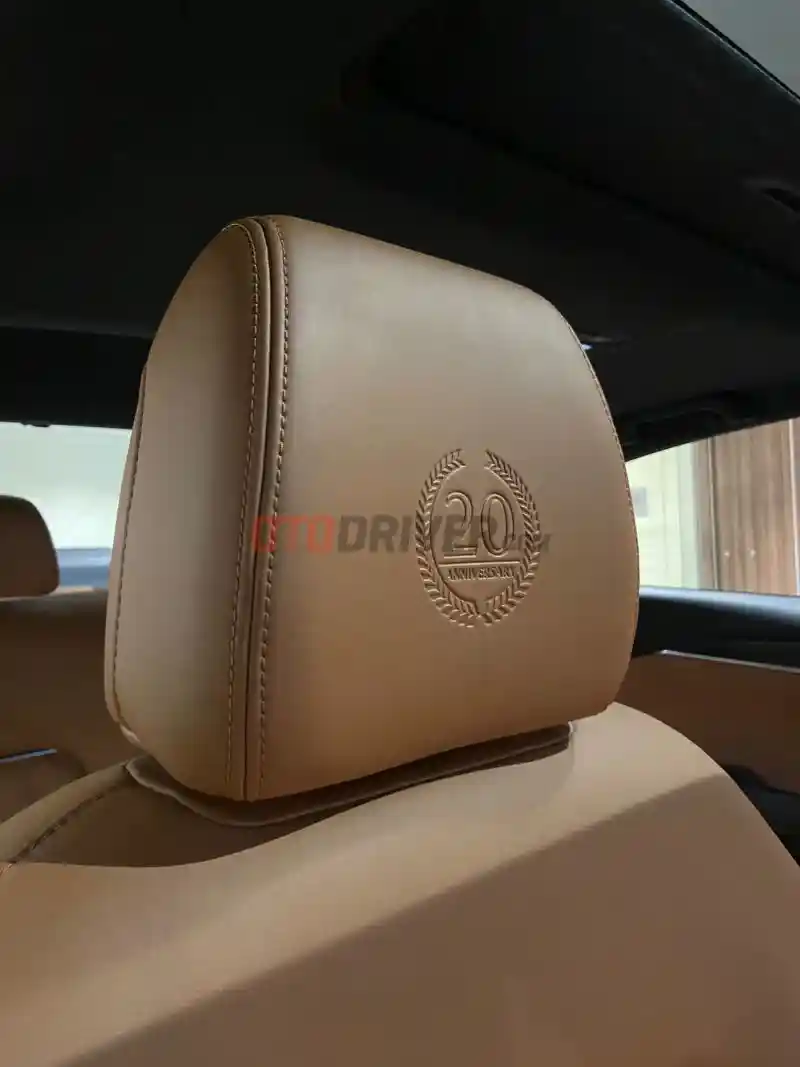 Pada headrest jok depan terdapat ukiran logo 20th Anniversary. Sentuhan anniversary yang sama juga terdapat pada jok dan trim pintu penumpang belakang. Tapi tanpa embos 20th Anniversary pada headrest.