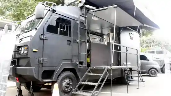 Dari luar, kesan sangar langsung hadir dengan baluran warna hitam di sekujur bodi bajanya. Kesan seram tersebut sirna begitu naik ke atas kabin belakangnya. Ini karena hadirnya peralatan dapur khas food truck.