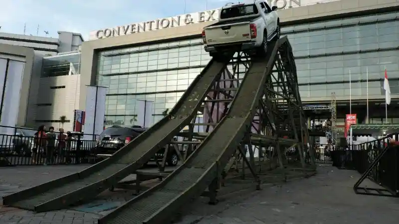 "Ini merupakan ramp buatan untuk mobil yang tertinggi dan tercuram yang bisa Anda coba di Indonesia," ujar Andy Wismarsyah, Presiden Direktur Seven Events, pelaksana GIIAS Surabaya Auto Show, di Surabaya. Sang Wakil Gubernur yang akrab disapa Gus Ipul juga tak gentar mencoba tantangan menaiki ramp di dalam mobil Mitsubishi Pajero Dakar 4x4.