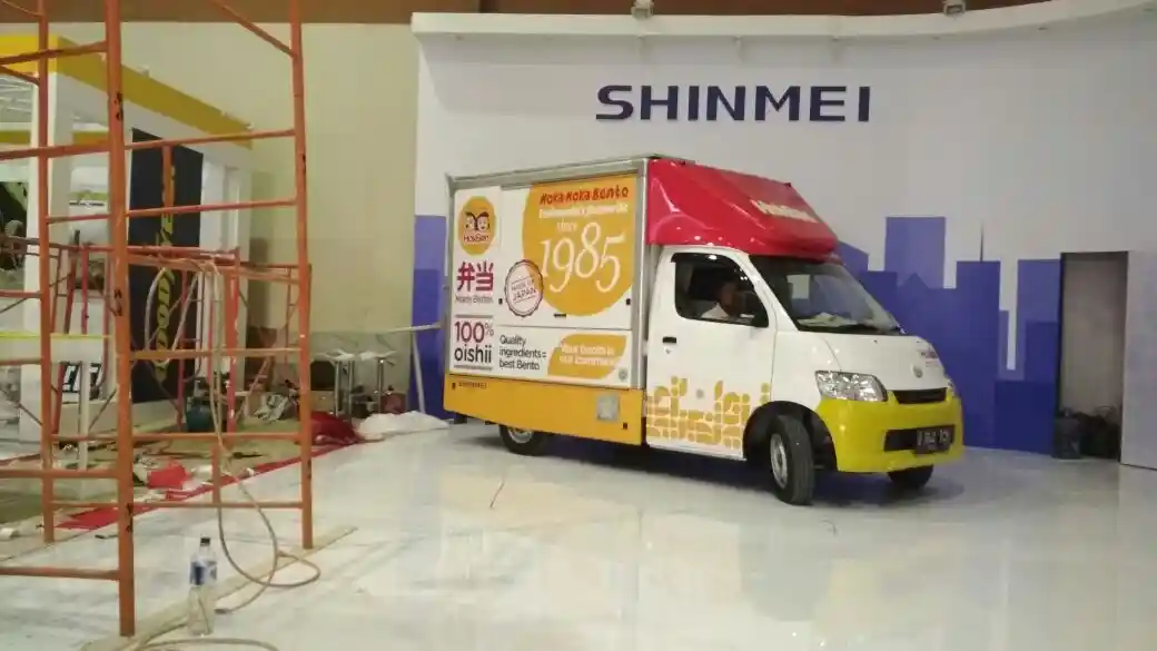 Berikutnya adalah booth karoseri Jepang, Shinmei. Shinmei memajang beberapa unit blind van Daihatsu Granmax rancangan karoserinya. Satu diantaranya adalah Grandmax blind van pesanan perusahaan jasa kiriman JNE.