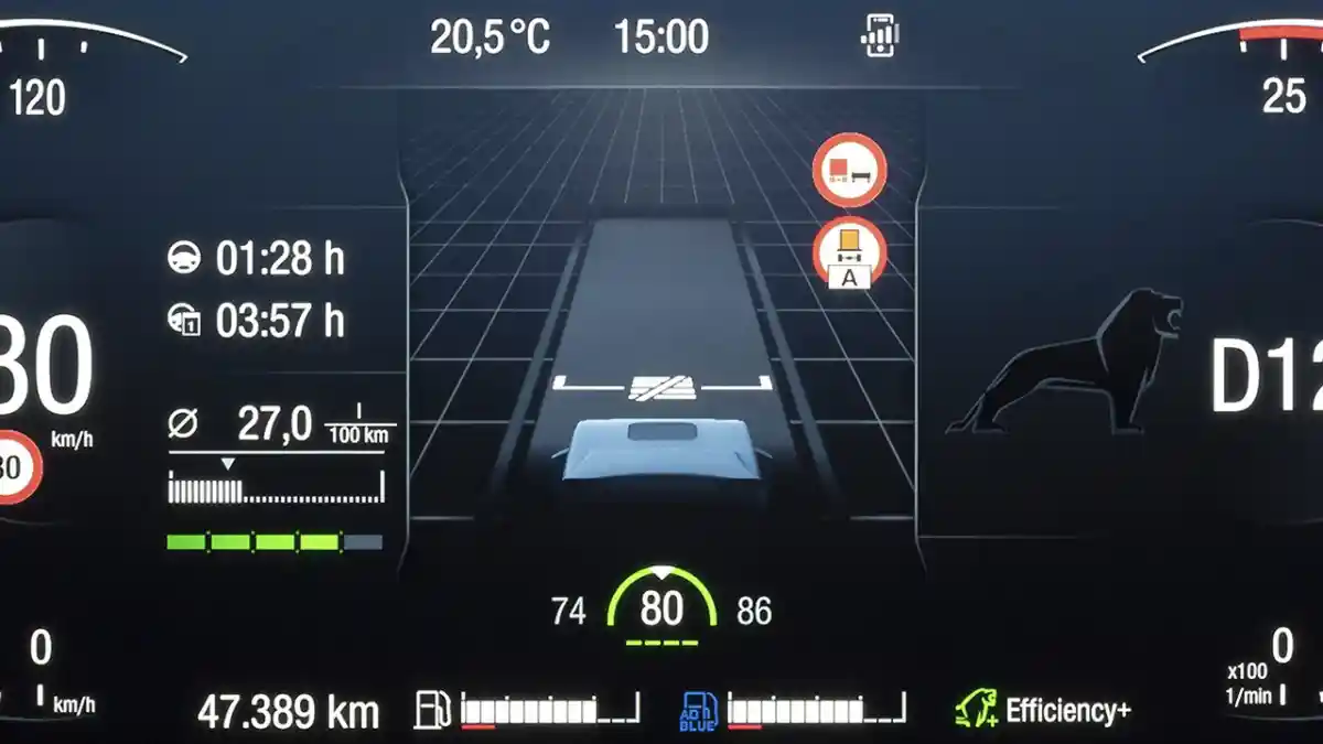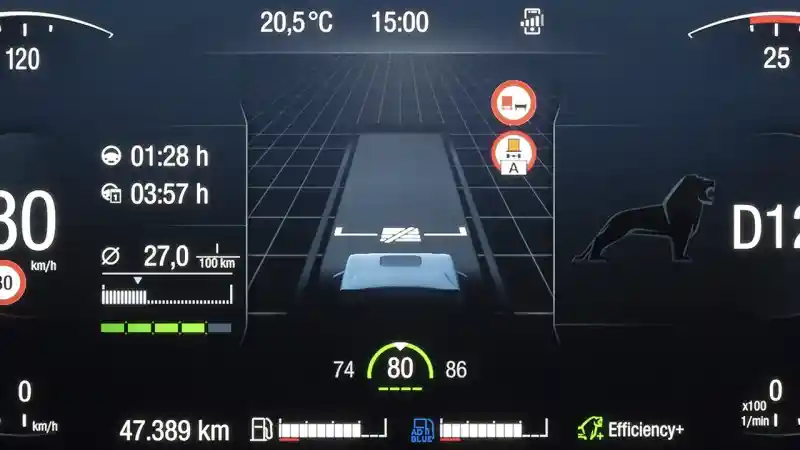 Sistem keamanan berkendara ini juga akan menjaga arah laju truk meski pengemudinya kurang piawai ataupun tidak berhati-hati. Karena sistem akan pengemudi secara visual dan akustik. Sebut saja ketika pengemudi mengantuk, terlebih saat malam hari, jika ditengarai jarak dengan kendaraan di depan berada dalam rentang yang tidak aman maka ada alarm yang akan memperingatkan pengemudi untuk segera bereaksi.