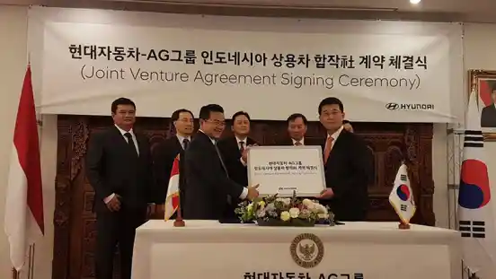 Iki Wibowo, President Director AMI dan Lee In Cheol, Vice President HMC, menandatangani kesepakatan kerjasama untuk membentuk perusahaan joint venture (JV) di Wisma KBRI, Seoul, Korea Selatan.