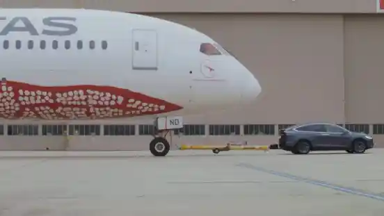 Tesla hitam tersebut adalah sebuah Model X P100D. "Pelum pernah ada sebauh pesawat maskapai yang diderek oleh mobil listrik. Setidaknya sampai saat ini," tulis Qantas pada keterangan tersebut.