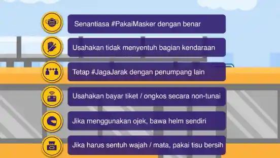Adapun protokol yang senantiasa harus dipatuhi dalam menggunakan Transportasi umum adalah sebagai berikut: