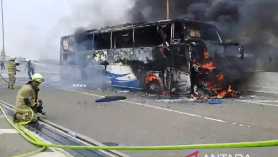 Sebuah bus pariwisata berpelat nomor polisi B 7179 VGA hangus terbakar saat melintas di penghubung (ramp off) ruas Tol Bekasi-Cawang-Kampung Melayu (Becakayu) menuju Tol Wiyoto Wiyono, Jatinegara, Jakarta Timur, pekan ini (24/10).