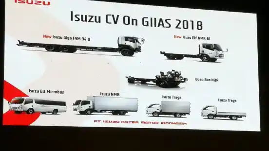 Di pameran ini Isuzu akan meluncurkan beberapa model kendaraan komersial di booth-nya di Hall 3. Setidaknya akan ada dua kendaraan baru yang akan diluncurkan berdasar keterangan Manajer Divisi Marketing Communication PT Isuzu Astra Motor Indonesia, Puti Annisa Moeloek di acara konferensi pers ketiga GIIAS 2018 di Jakarta, Selasa (10/7/2018) lalu. Masing-masing adalah truk ringan Isuzu Elf NMR 81 dan truk medium duty Isusu Giga FVM 34 U.