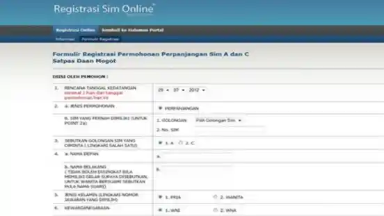 Caranya adalah sebagai berikut. Pertama, masuk ke website registrasi SIM Online Satpas Daan Mogot http://lantas.metro.polri.go.id/regsimonline Selanjutnya, pindahkan ke jendela atau tab baru dengan mengklik formulir registrasi yang harus diisi oleh pemohon perpanjangan SIM A dan C dengan identitas yang benar sesuai KTP dan SIM lama.